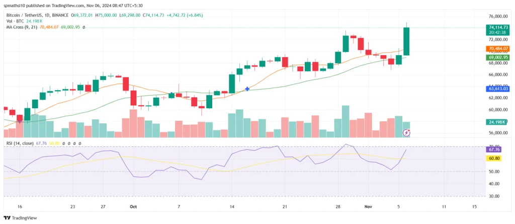 Bitcoin’s rise reflects a mix of election-related sentiment, strong technical signals, and mainstream adoption. As the market watches for Bitcoin to surpass the $75,000 barrier, it seems poised to explore new highs. With support levels holding and an uncertain election outcome, BTC continues to demonstrate its resilience in the digital economy.