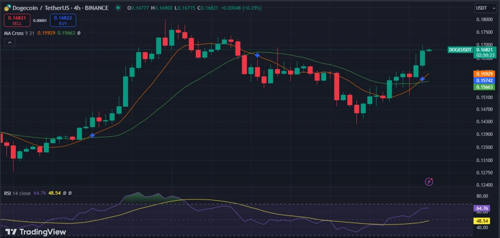 Zooming in on the four-hour chart, a bullish trend appears, with the 9-day moving average crossing above the 21-day average. Dogecoin is now trading above the upper and mid-lines of its Bollinger Bands, signaling upward momentum.