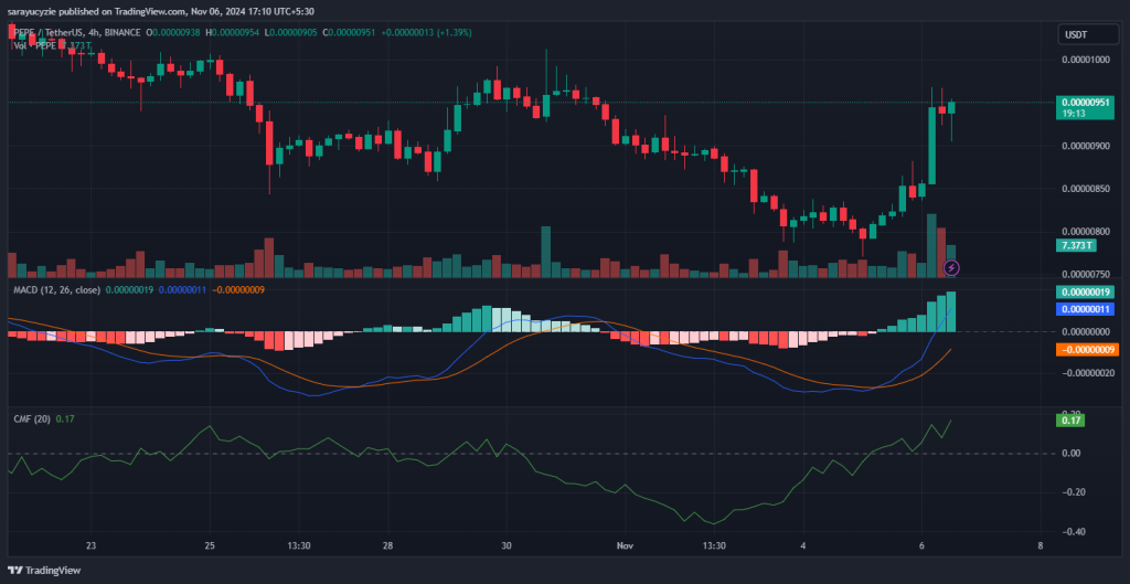 Additionally, the Chaikin Money Flow (CMF) indicator at 0.17 shows strong money flow into the asset, while PEPE’s daily trading volume has grown by over 137%.