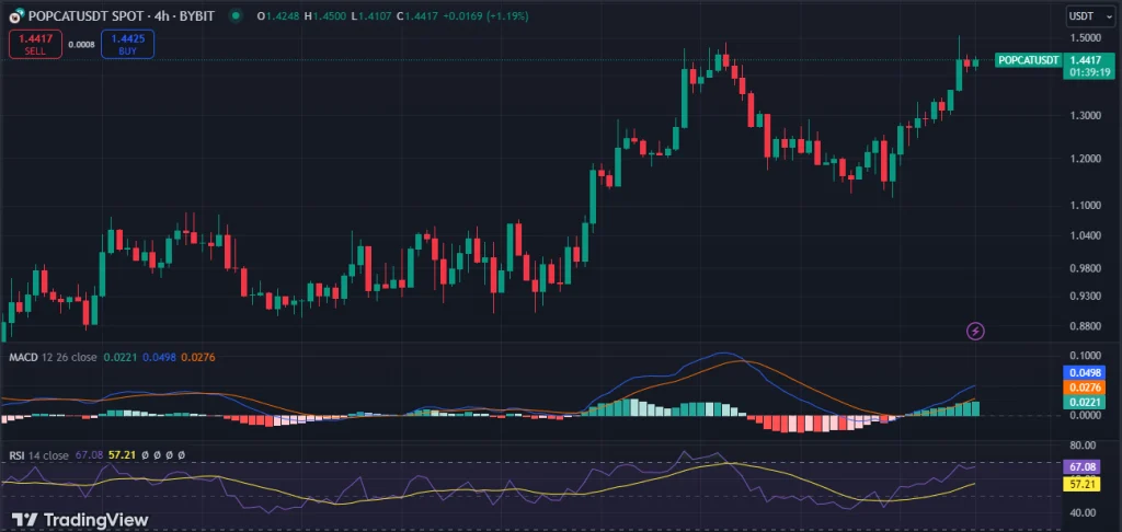 Currently, Popcat (SOL) is priced at $1.44, with a market capitalization of $1.40 billion. Daily trading volume has increased by around 16%, reaching $169.40 million, reflecting high market activity driven by traders taking advantage of the price fluctuations.