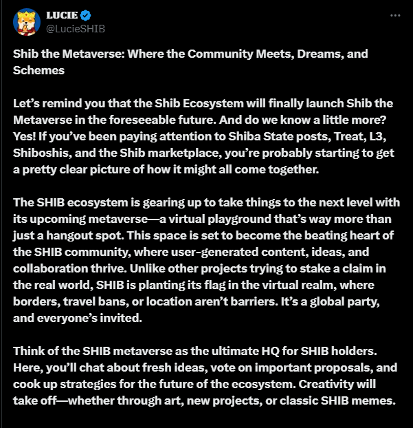 The Shiba Inu team revealed the highly anticipated “Shib The Metaverse,” a virtual space designed to engage the SHIB Army. Lucie hinted that the launch is approaching, raising optimism among crypto enthusiasts. In a recent post on X, Lucie explained that this metaverse is not just a social hub; it is intended to be the community’s heartbeat, offering users a space to express themselves through art, projects, and classic SHIB memes, encouraging a culture of innovation.