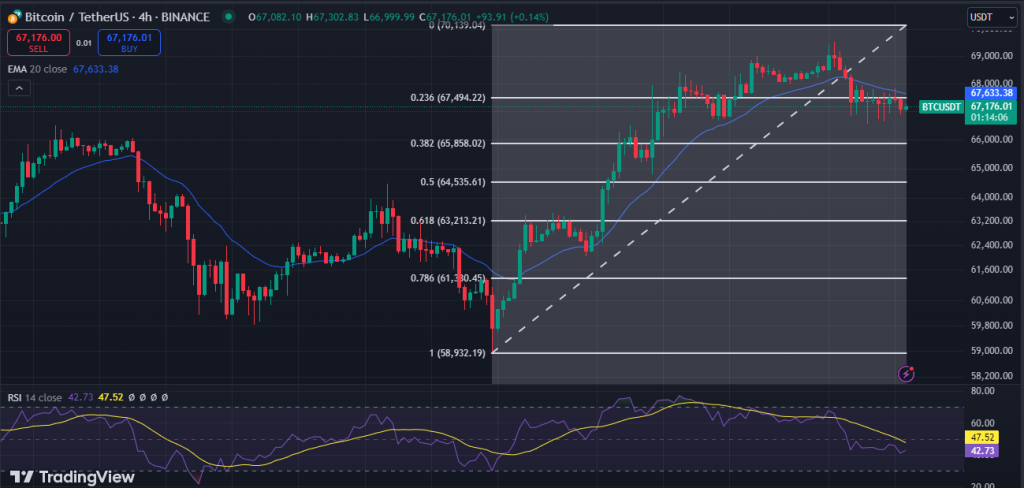 From a technical perspective, Bitcoin’s price is nearing the 23.6% Fibonacci retracement level, calculated from its recent low of $66,536 to its high of $69,875. However, it remains under $67,300 and the 9-day Exponential Moving Average (EMA), with a Relative Strength Index (RSI) of 47, indicating a neutral market outlook. A contracting triangle pattern is also forming on the 4-hour chart, with support around $66,677.