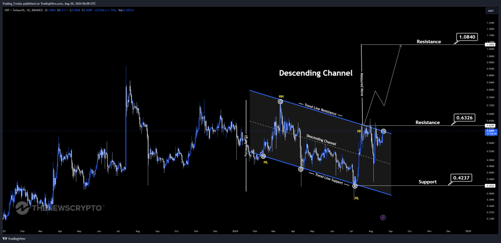 According to technical analysis, XRP follows a descending channel pattern. While this short-term trend is bearish, it may lead to a longer-term uptrend. If the pattern persists, XRP could rise to resistance levels of $0.6326 and $1.0840. However, a trend reversal might bring the price down to the support level of $0.4237.